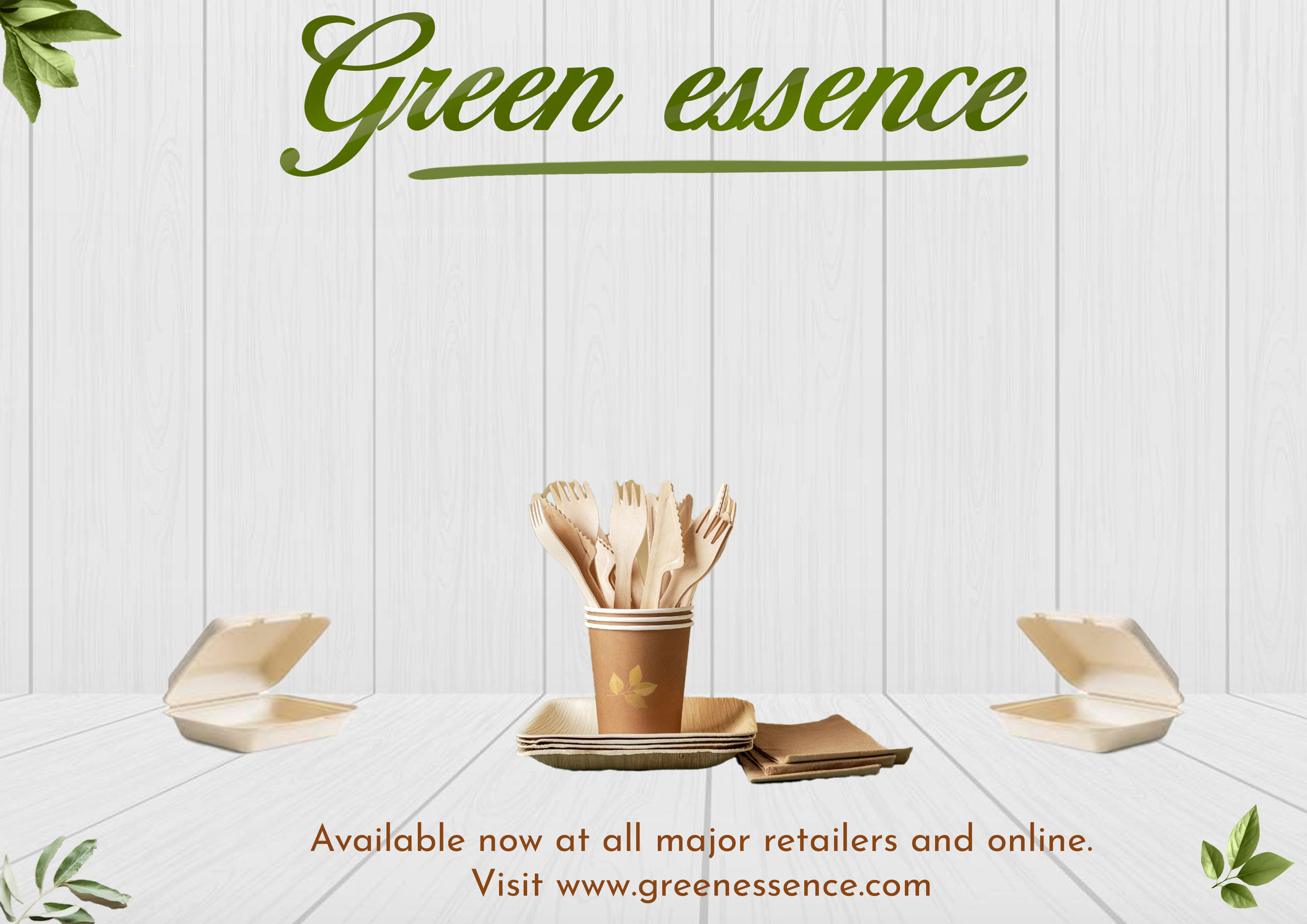 We’re introducing a new line of eco-friendly products called “Green Essence.” These products range from reusable bags to biodegradable utensils. The goal is to create a captivating launch poster that highlights the environmental benefits and elegance of the product line. The target audience are eco-conscious consumers aged 18-45, who prioritize sustainability and are inclined towards aesthetically pleasing, minimalist designs.