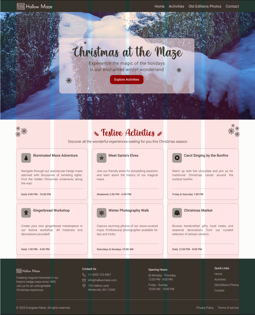 Create a website home page for a hedge maze doing a Christmas event. I want it to have a footer with the contact information. The hero banner needs to be the hedge maze under snow. Under the banner there should be the list of activities planned, which you can make up. The top menu bar should include a category for old editions photos, a contact category