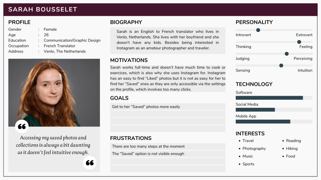 If Sarah can access faster her “Saved” posts, then she will gain time and want to use Instagram more/not look at other apps or websites for recipes, travel tips or sports exercices.